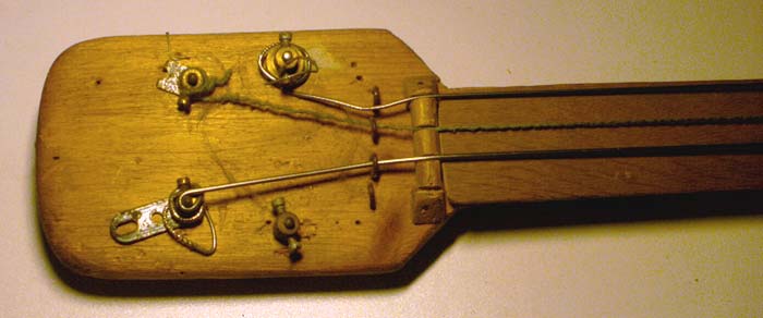 I decided to narrow the floorboard at one end to make it possible to finger the string, and to add three more stings. I attached the off-cuts at the body end to make the thing look a little for normal and fitted Meccano parts as ersatz machine heads to allow adjustment of the string tension. There were no frets and the thing was never remotely in tune. I altered the thickness of the strings by unwinding strands from each bundle to approximate what I'd seen of bass guitars on TV. The resulting spiral shaped strings were not great sounding. To reduce finger wear I wound cotton around them which improved the feel of things, though it frayed away pretty quickly.